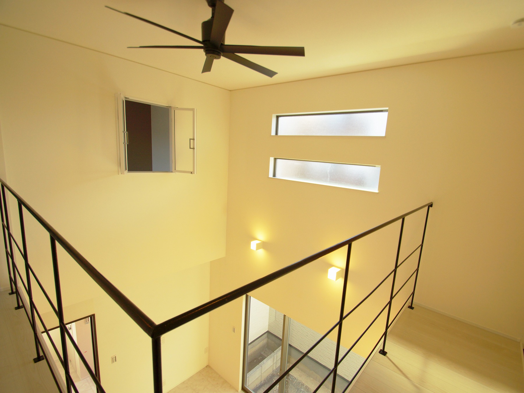リビングの吹き抜けとアイアン階段がお洒落なお家。 壁の間接照明もとてもカッコイイ。